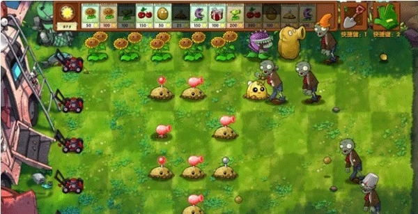 1、开局先用樱桃炸弹处理土豆,同时在第一排把向日葵种满,一个土豆雷的时间刚好够完成向日葵的种植。