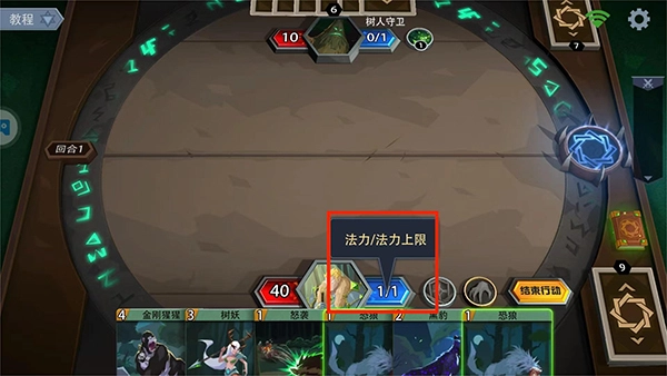 9、卡牌左上角的数字代表打出该卡牌需要消耗的法力,蓝色框显示的是我们当前的法力上限,这个上限是能够提升的。