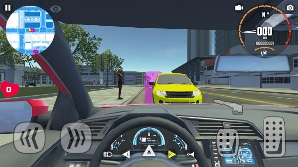 2、操控角色完成上车动作,坐进车内后会看到图中展示的界面,左侧是方向按键(也可点击左上角的“播放”按钮进入设置,挑选适合自己的控制类型),右侧为油门、刹车踏板以及手刹,中间区域则分布着危险报警闪光灯、转向灯、雾灯和喇叭。在熟练掌握这些操作技巧后,就可以查看地图上的乘员位置,然后将他们送往目的地啦!