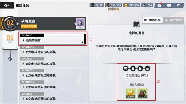 玩家能够在任务栏里查看①「主线任务」,还有②「任务内容」与「完成任务时能得到的奖励」。