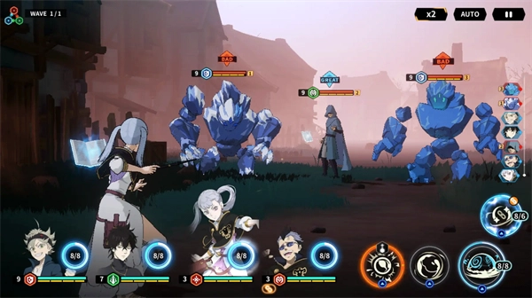 游戏采用回合制卡牌战斗机制,每场战斗默认派出3名角色出战。战斗中可使用普通攻击、技能与必杀技,玩家需巧妙把握技能释放的时机,并触发连携大招,借助属性克制关系来造成大量伤害。此外,特定羁绊的角色组合还能触发合击技,进一步提高战斗的效率。