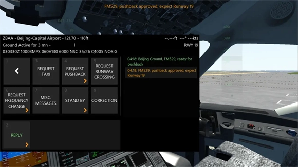 3、接下来申请滑行(requesttaxi),操作方式是按下左侧界面的第二个按钮来提交滑行申请。按照常规流程,塔台会给出回复,我们查看回复内容后,点击REPLY按钮执行相应操作。