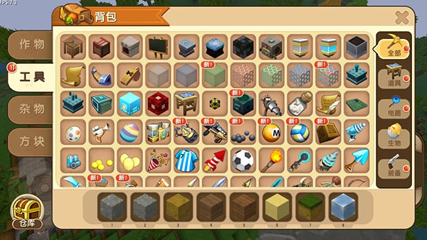 2、打开背包,你会发现里面有大量功能强大的工具和武器,这些能让你在冒险时更具优势