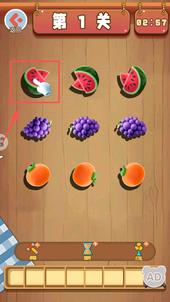 3、进入关卡后,点击水果进行匹配操作,达成关卡设定的目标,以此来考验你的反应速度。