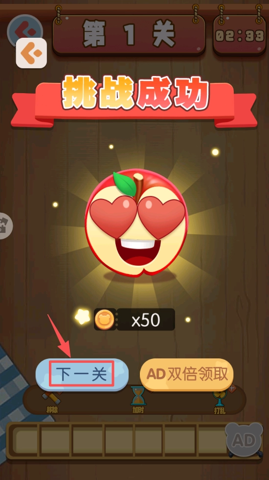 4、挑战成功后,点击“下一关”按钮继续挑战,以获取更多乐趣与奖励。