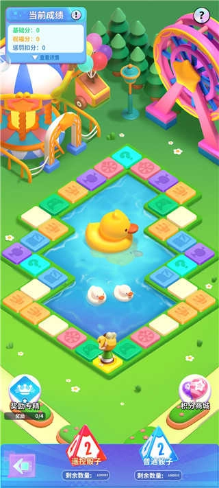 玩家在休闲乐园里,可以用普通骰子在地图上前进,也能通过遥控骰子来前进指定的步数,到达终点后会结算本轮获得的积分,这些积分可以用来兑换礼品。