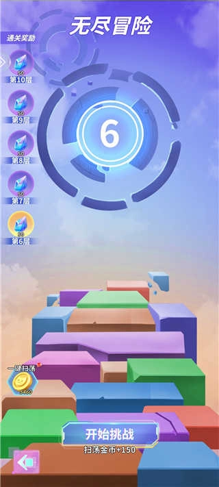《无尽冒险》设有层层递进的关卡,每通关一层都可获得钻石奖励;每日进行扫荡还能获取金币,且层数越高,金币收益越丰厚。