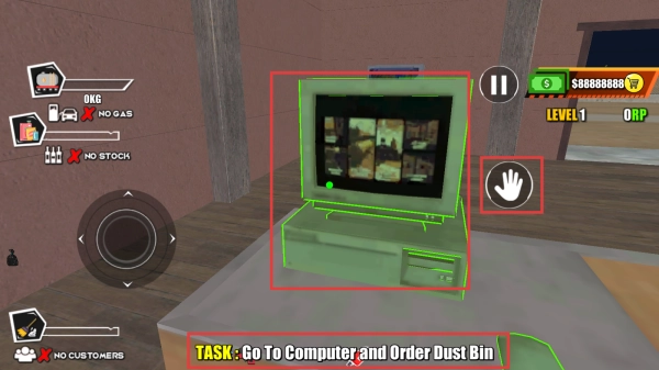 1、开启游戏后,操控摇杆指引角色移动至电脑旁,随后点击对应按键完成垃圾桶的订购操作。