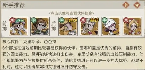 介绍:这6位伙伴在前期都比较容易获取,唐娜与盖是出色的前排,自身具备较强的回复能力。黛娜能快速输出伤害,克里斯朵拥有较强的血线压制能力,他们都能为芭芭拉创造斩杀机会,之后艾德琳还能进一步扩大优势。当战局处于劣势时,也可以围绕黛娜和艾德琳来展开防守反击。