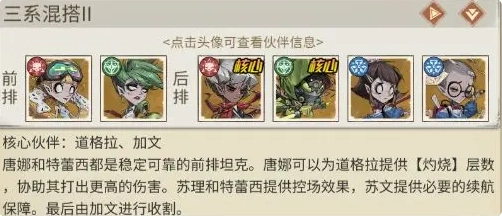 唐娜与特蕾西均为稳定可靠的前排坦克。唐娜能够为道格拉叠加【灼烧】层数,助力其输出更高伤害。苏理和特蕾西负责提供控场效果,苏文则保障团队必要的续航能力,最终由加文完成收割。