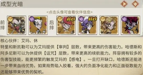 特里与斯凯勒能为艾玛叠加【审判】层数,提升其伤害输出能力;哈德斯和阿多尼斯可给休积累【诅咒】层数,增强他的续航效果。这套阵容包含较多伤害类技能,能更频繁地触发艾玛的【感电】效果。一旦突破敌方防线,哈德斯还能进一步扩大血线优势。若战局陷入僵持,阵容强大的负面状态净化与正面增益驱散能力,也能创造扭转局势的契机。