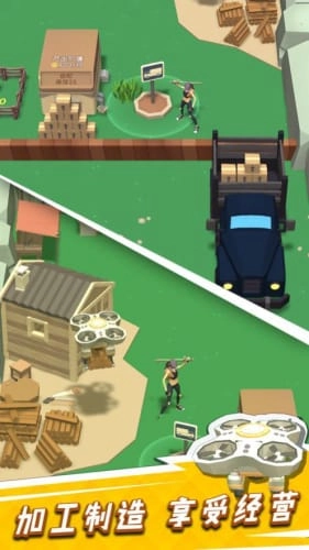 3、把得到的树木加工成木料,借助无人机运送到工坊制作木制品,通过出售这些制品赚取金币来升级伐木场;