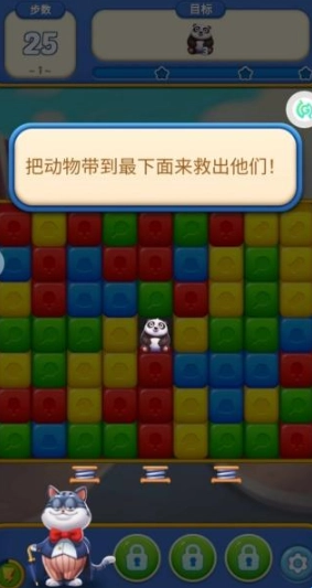 2、按照提示要求,要把熊猫移到最底部。仔细观察方块的排列方式,通过清除熊猫周边和下方的方块,来为熊猫开辟出能够下落的通道。