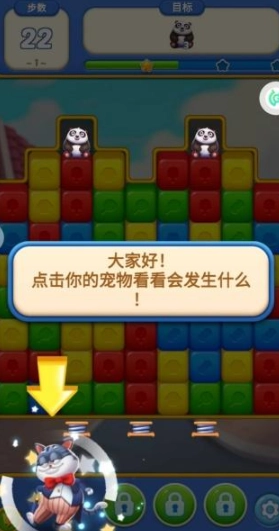 4、根据提示点击宠物,即可触发宠物相关的互动效果,有机会获得道具、步数奖励或是特殊消除能力,借助这些助力来消除方块,从而推动熊猫下落。