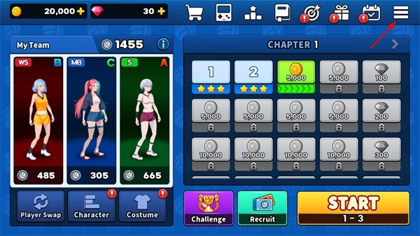 2、点击主界面的“更换选手”选项,即可挑选不同位置的角色安排上阵。