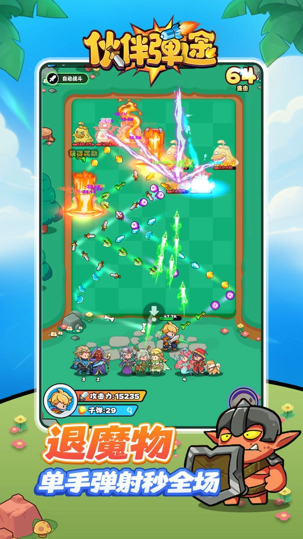 《伙伴弹途》的游玩体验相当解压,玩家借助弹球机制,能直观看到怪物被逐步击溃的过程。发射弹球前需精准调整角度,游戏会以虚线标注弹球轨迹,同时可收集碎片来提升角色等级。