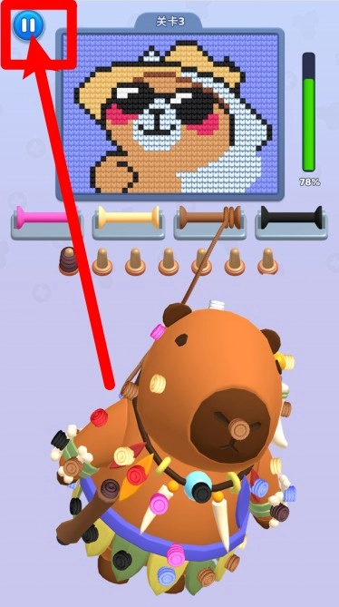 2.左上角设有暂停按钮,按照不同毛线颜色的提示依次填充色块,逐步补全细节,最终完成戴墨镜熊角色的像素图像。
