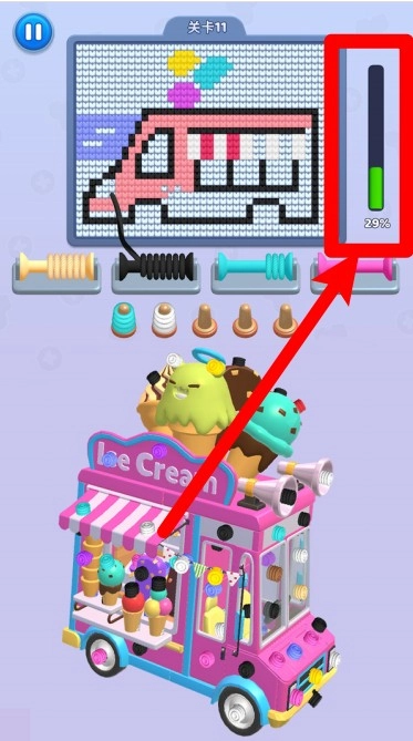 3.右侧进度条会实时展示完成进度,需要按照顺序用黑色和蓝色毛线填充对应的区域,逐步绘制出冰淇淋车精致的像素画造型。