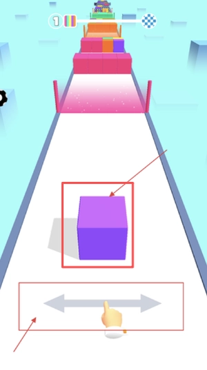 1、滑动底部的左右箭头,操控紫色方块移动,让它沿着跑道前进,为撞击同色障碍做好准备。