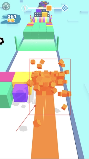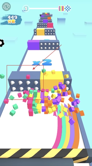 2、操控方块去撞击相同颜色的障碍物,在成功将其粉碎后借助产生的冲击力继续前进,以此不断积累分数并拉长跑酷的距离。