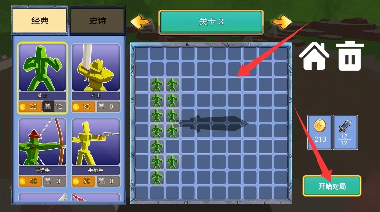 2、在布阵阶段规划勇士的站位组合与布局,点击开始对局按钮即可启动自动战斗流程。
