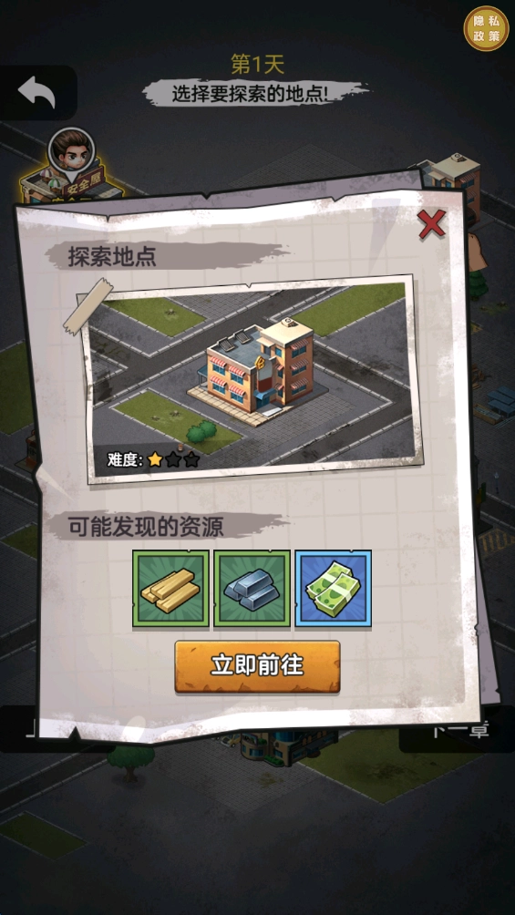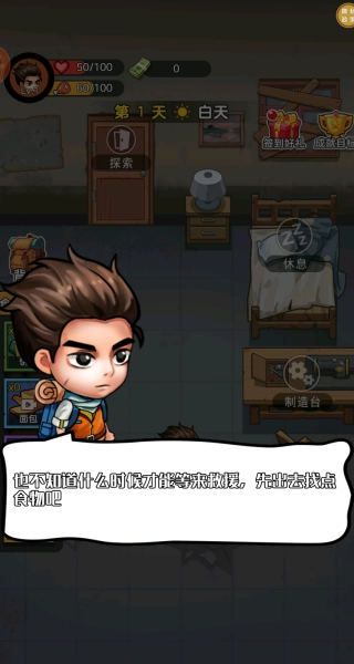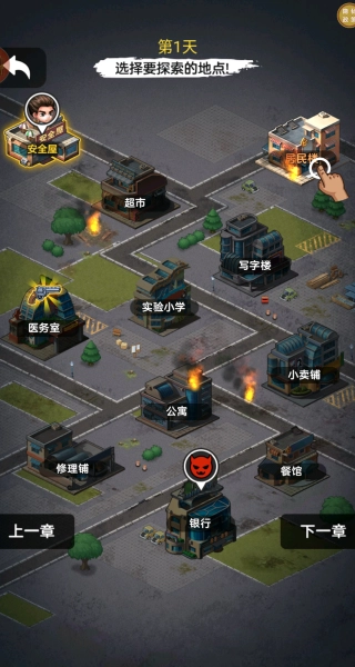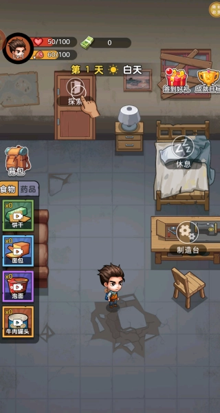 3.开启“第一天求生”任务后,点击【探索】按钮就能外出活动,在废墟里搜寻食物和武器,增强战斗力来抵抗丧尸的攻击。