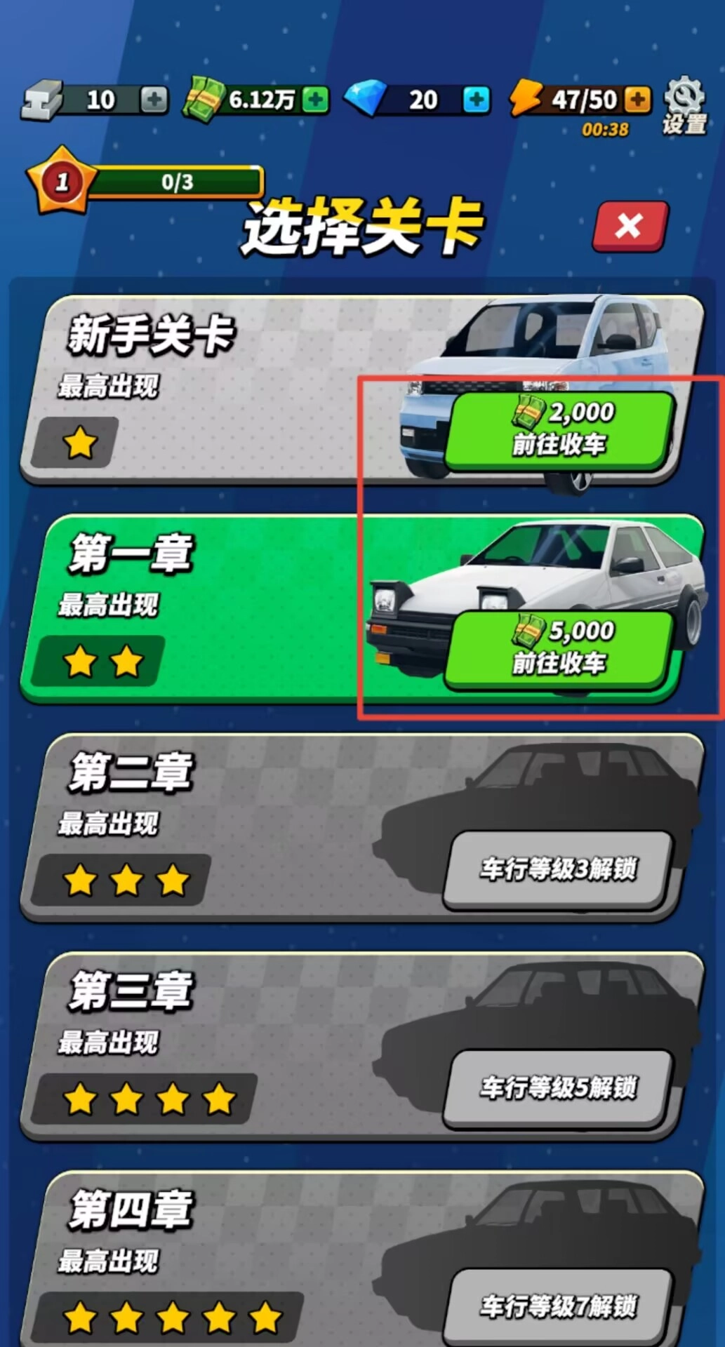 1、从主界面左下角的收购功能入口进入关卡选择页面,该页面涵盖新手教学与正式章节内容,选定关卡后即可启动收车流程。