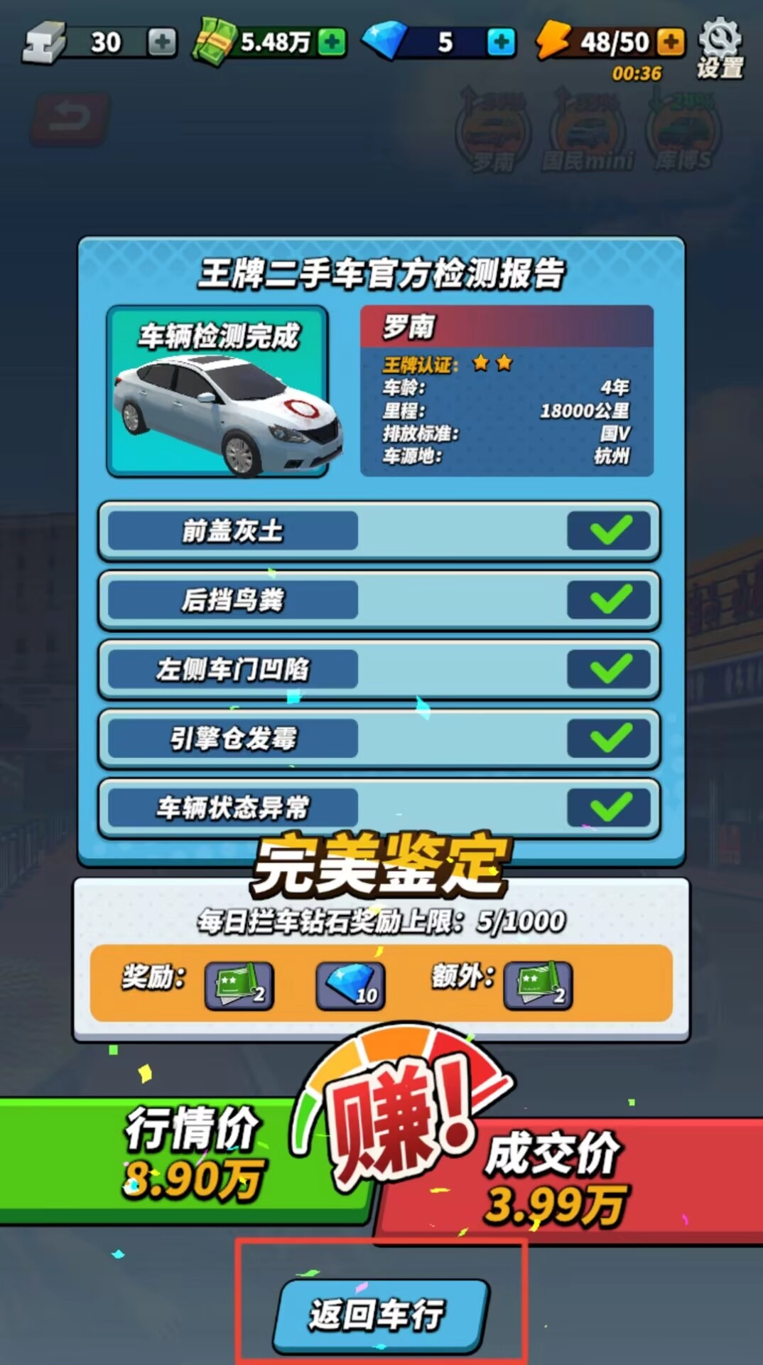 3、完成交易后进入结算界面,完美鉴定可获得稀有宝石和资金奖励,确认后返回车行继续运营。