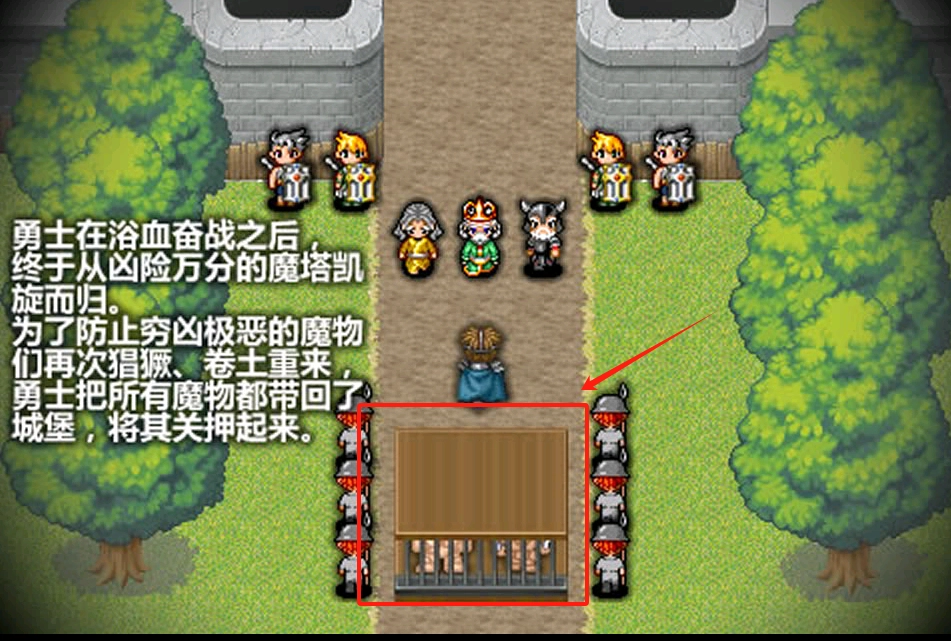 2、土路上有手持武器的村民和士兵。站在中间穿蓝色衣服的是主角,下方木栅栏里关着魔物,要注意别被士兵发现。