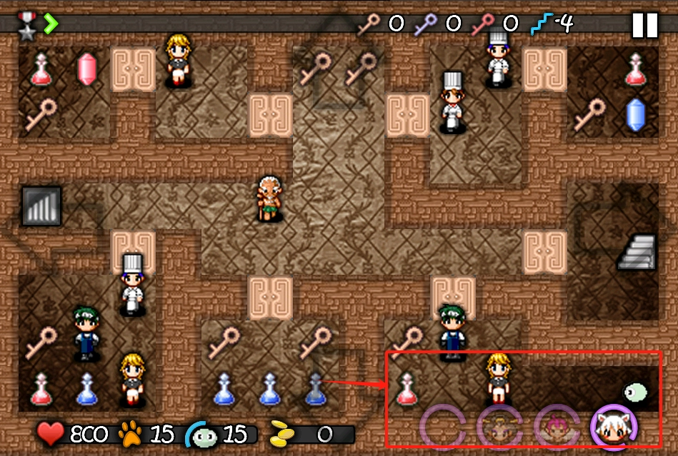 3、左上角显示药水补充状态,上方已获取钥匙数量为0。中间区域显示生命值800、步数15,右下角的四个圆圈是技能,可根据需要点击使用。