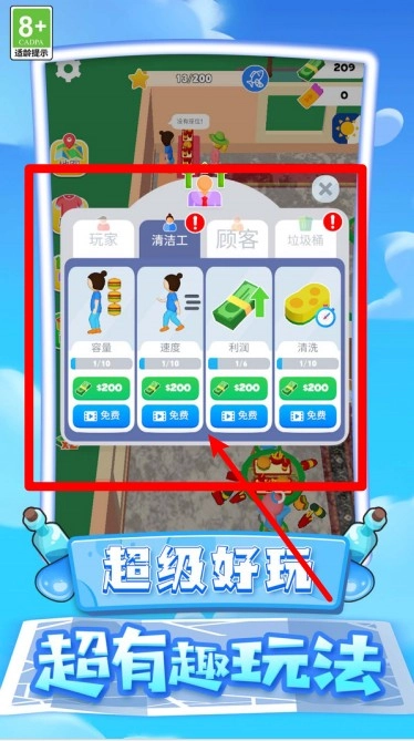 2.角色升级系统:玩家能够进入角色面板,对玩家自身、清洁工、顾客以及垃圾桶开展升级操作,以此提高速度、收益和清洁效率,从而使整个餐厅的运营更为顺畅。