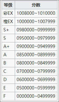 1、每个谱面的满分均为1010000分,评分以Perfect判定作为基准,不同判定对应的赋分比例如下: