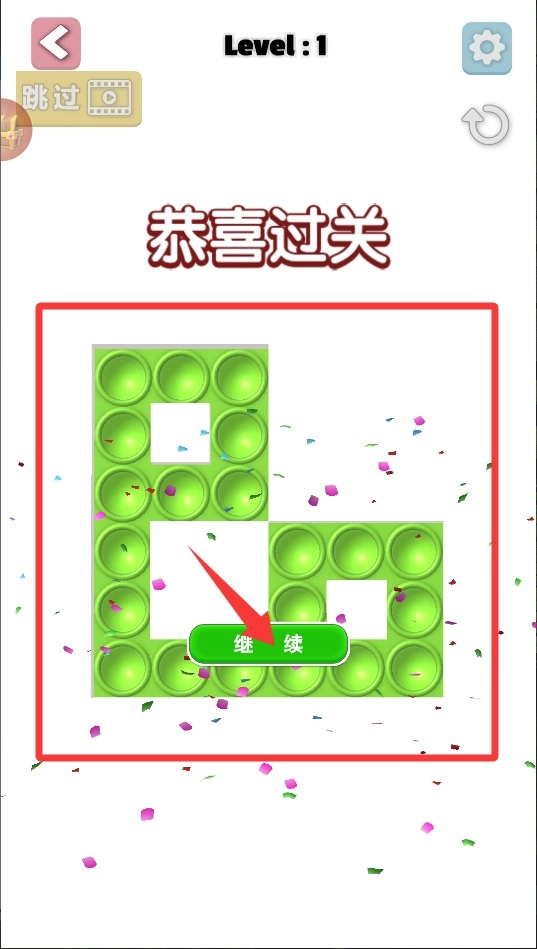 4、当所有空白区域都被彩色泡泡填满后,画面会呈现通关特效,系统将依据剩余泡泡的数量给出星级评分。
