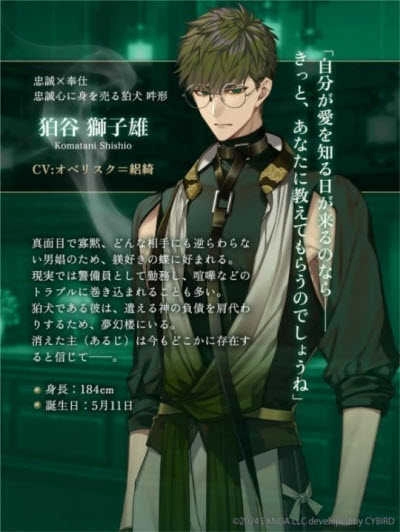 狛谷狮子雄(こまたにししお)的配音演员是ァ≠リスク=絽绮。他的声音里所饱含的自信与魅力,想必会成为玩家们的新喜爱。
