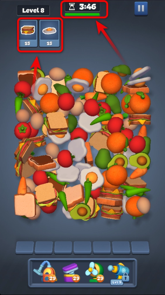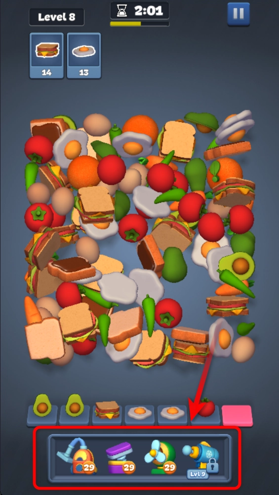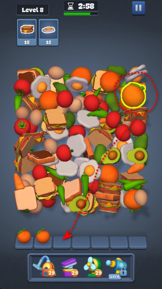 2.点击上方相同的物品,将其移动到下方,若下方出现三个相同的物品,即可完成消除。
