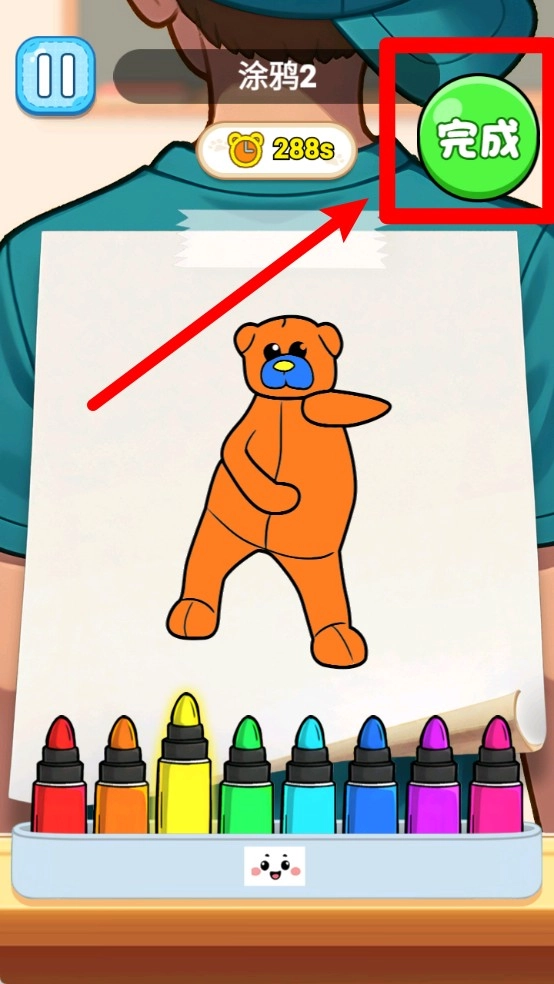 2.绘画步骤:在限定时间内用彩色画笔给图案填充颜色,填好后点击完成按钮提交,以保证作品被保存并进入通关判断环节。