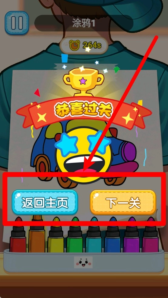 3.完成关卡:任务达成后会呈现过关提示,玩家可以选择返回主页重新开始,或者点击下一关继续新的绘画挑战内容。