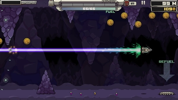 控制小火箭飞行:玩家要操控小火箭进行飞行,借助发射火箭的方式来跨越障碍并收集金币。