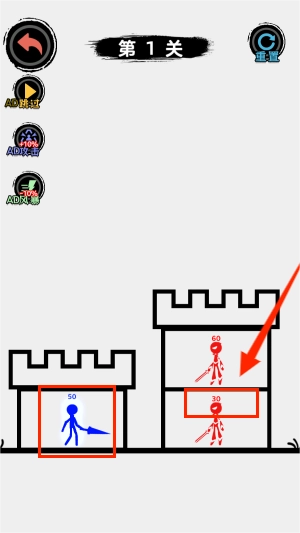 2、爬塔需要通过战斗来实现,数字代表武力值,点击需要战斗的红色火柴人就能开启战斗。