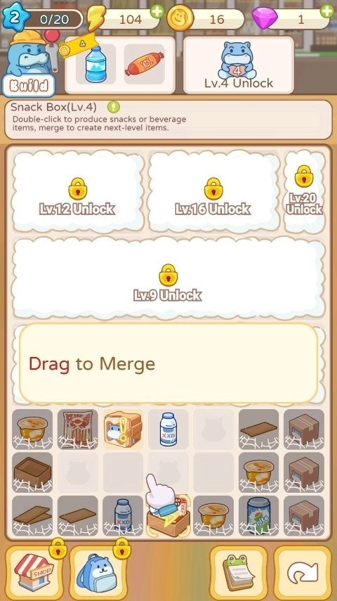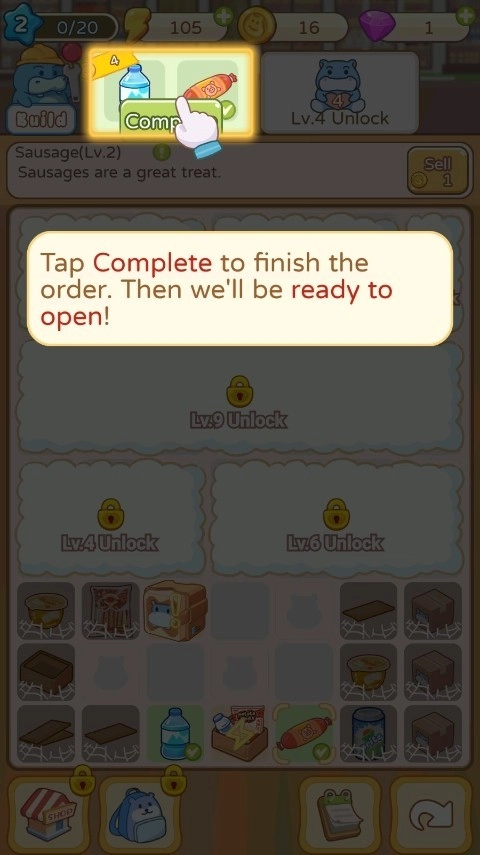 3、合成矿泉水、香肠这类商品后,要记得把它们摆上货架,保证货架上的商品供应充足。