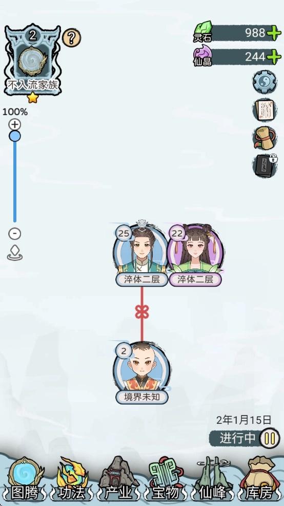 4、家族图腾初始解锁的功法为元类[镜元诀],可安排家族成员进行修炼,每月会自动提升修为。