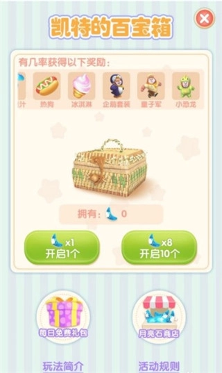 6、使用专属道具月亮石能够打开百宝箱,每次开启宝箱要消耗1个月亮石,也可以用8个月亮石一次性开启十个宝箱,开启宝箱后有机会随机得到熊熊乐园、玩偶公仔、食物和金币之类的物品。