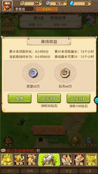 2、挑战敌军可获得大量奖励,还能增加挂机收益;