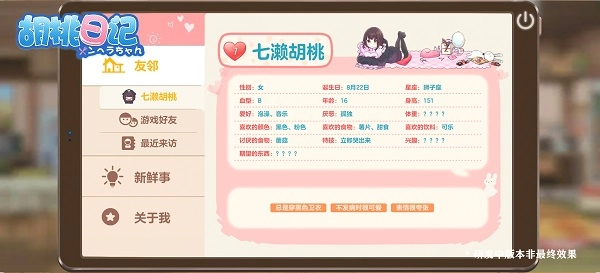 时间和现实同步,所以得记得让冰箱里储备足够的食物,不然胡桃说不定会饿肚子呢!晚上她还会提醒你早点休息,帮你养成健康的作息习惯。要是你用心照顾她,她也会留下自己画的表情包来表达感谢,让人看了忍不住嘴角上扬。