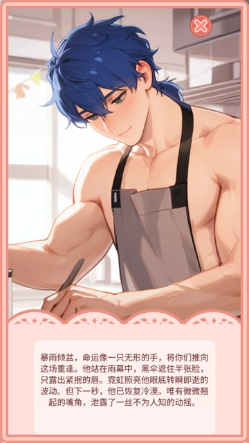再说说不足之处:男主的画风一眼看上去就很AI,而且约会到后面感觉挺油腻的。倒不是说AI生成的就不好,只是会给人一种“十全大补汤”的既视感——就是太过刻意、用力过猛了。约会时的文案也显得不太用心,往往没说几句话就切换图片,感情铺垫基本没有,直接就进入亲密环节了。和男主互动的选项设置得挺多,这点是不错的,但问题在于正确选项只有一个。每个人的想法本来就不一样,选项里可以存在不合适的,但这种“唯一解”的设定实在让人头疼,毕竟选错一次就得从头开始(要么就得看广告才能继续)。