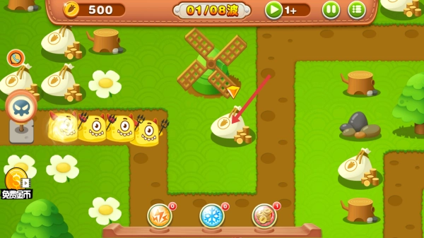当第01/08波怪物来袭时,点击下方的闪电、冰冻技能,并在怪物密集的区域释放,以此对怪物造成群体伤害或使其减速。