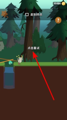 3、要是角色在前往终点的路上摔倒了,界面会弹出点击重试的提示,点击这个按钮就能重新开启当前关卡的挑战,这时候可以调整操作方法,努力顺利走到终点完成通关。