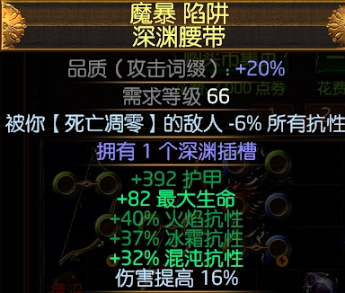 腰带可以提供补血量、抗性和力量属性,还能附魔死亡凋零效果——毕竟秘术升华本身就带有死亡凋零,正好能搭配上。要是腰带本身不带力量的话,那就用深渊珠宝来尽量补足这部分属性缺口。