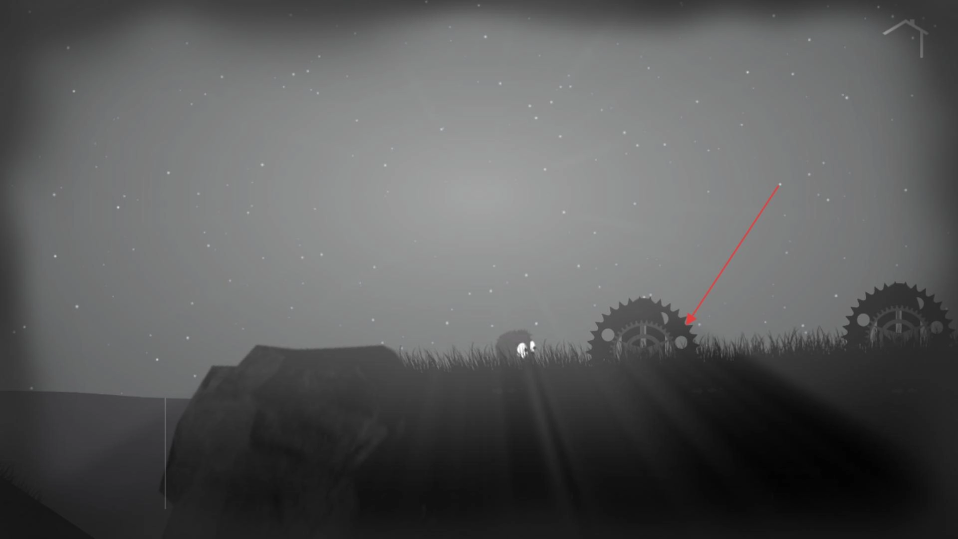 继续前进,帮助角色躲开齿轮陷阱,在星空与草地交织的区域穿行,开启新的场景,推动游戏剧情的发展。
