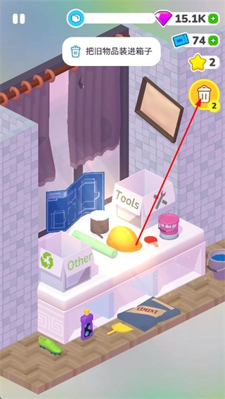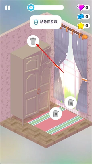 点击旧家具上的垃圾桶图标,就能移除旧家具,从而清理出房间空间。